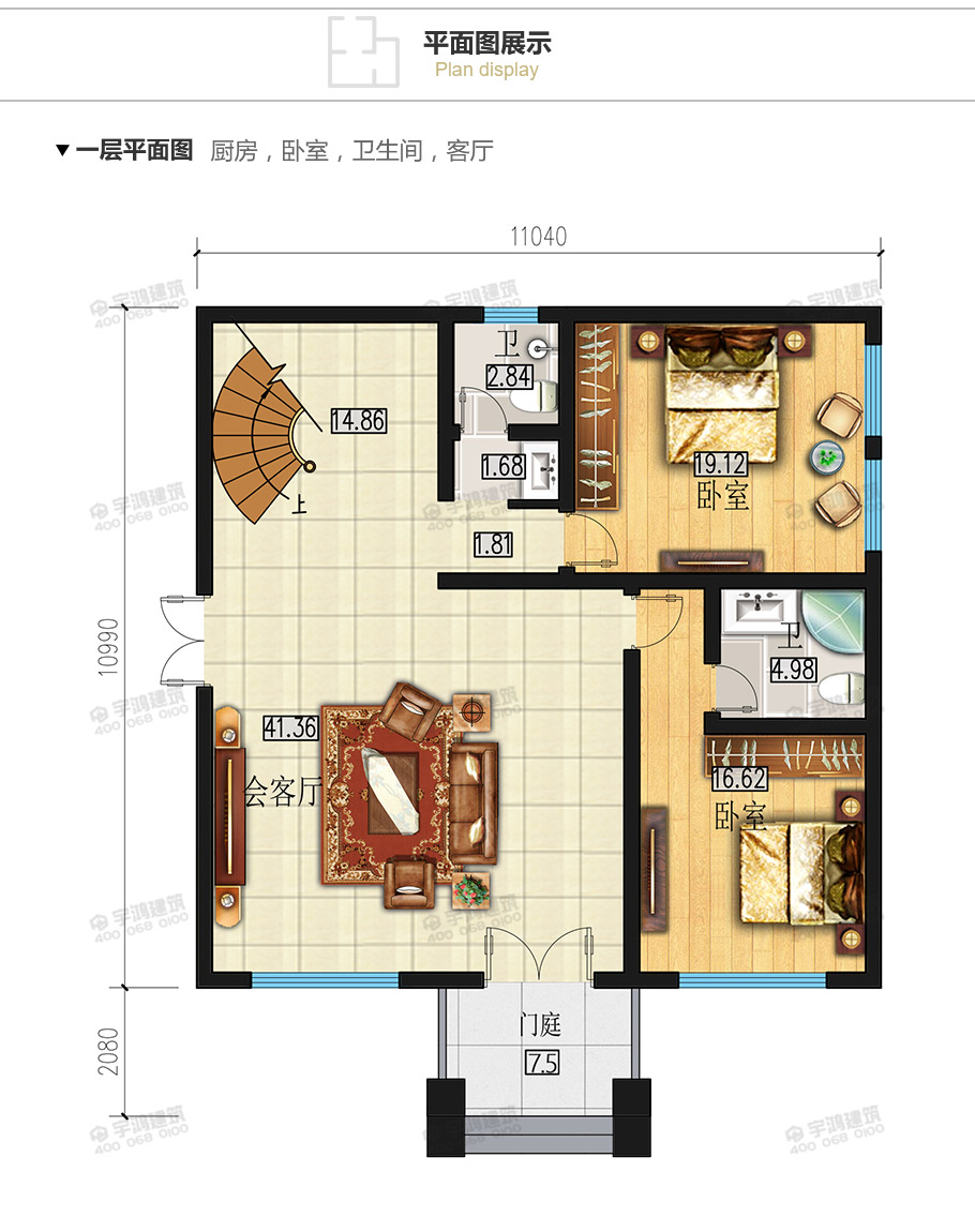 開間:11.04米 進深:13.07米 占地面積:121.3平方米 建筑面積:336.88平方米
