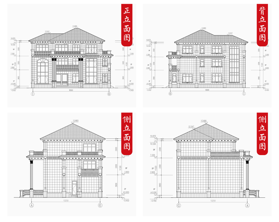 建筑立面圖:東立面圖,西立面圖,南立面圖,北立面圖,剖面圖;