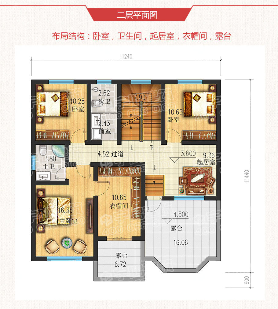 本套120平二層舒適農村自建房設計圖紙為歐式風格,外觀精致、小巧,戶型經濟、實用,紅色坡屋頂色彩艷麗,搭配黃色外墻和漂亮文化石極具美感,主體造價16-20萬之間,是經濟自建房首選方案。