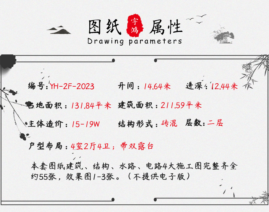 | 風格:中式 | 層數:二層 | 結構形式:磚混結構 | 圖紙編號:YH-A-2023 |