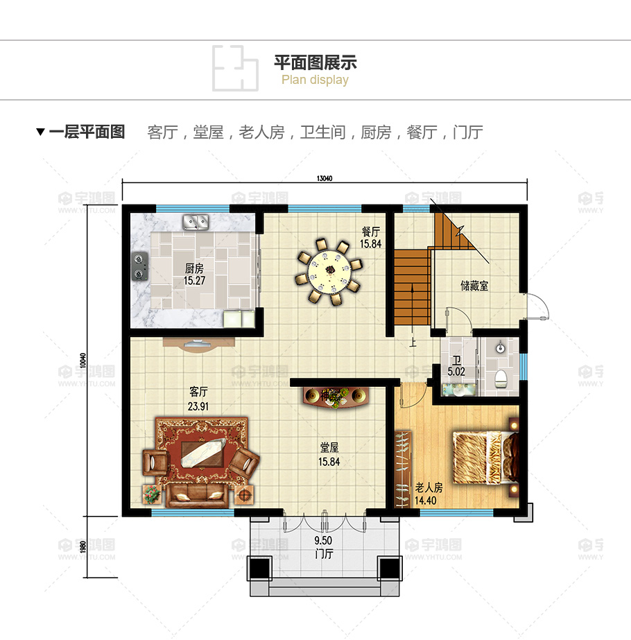 | 開間:13.04米 | 進深:12.02米 | 占地面積:130.9平方米 | 建筑面積:340.23平方米 |