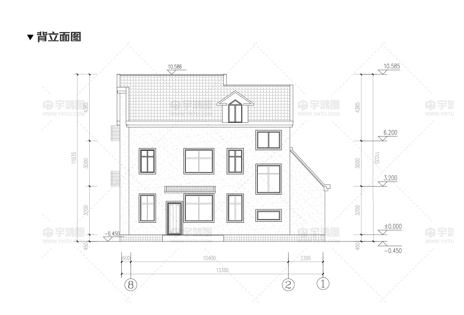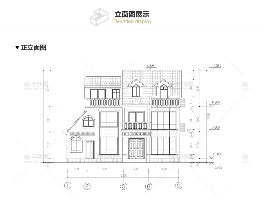 建筑立面圖:東立面圖,西立面圖,南立面圖,北立面圖,剖面圖;