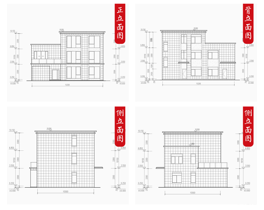 建筑立面圖:東立面圖,西立面圖,南立面圖,北立面圖,剖面圖;