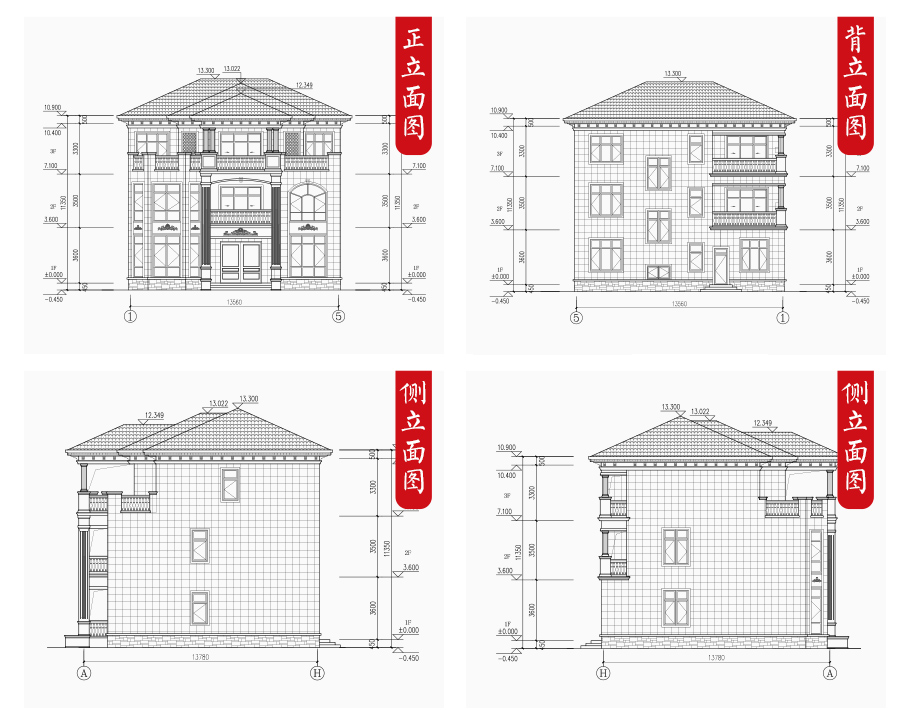 建筑立面圖:東立面圖,西立面圖,南立面圖,北立面圖,剖面圖;