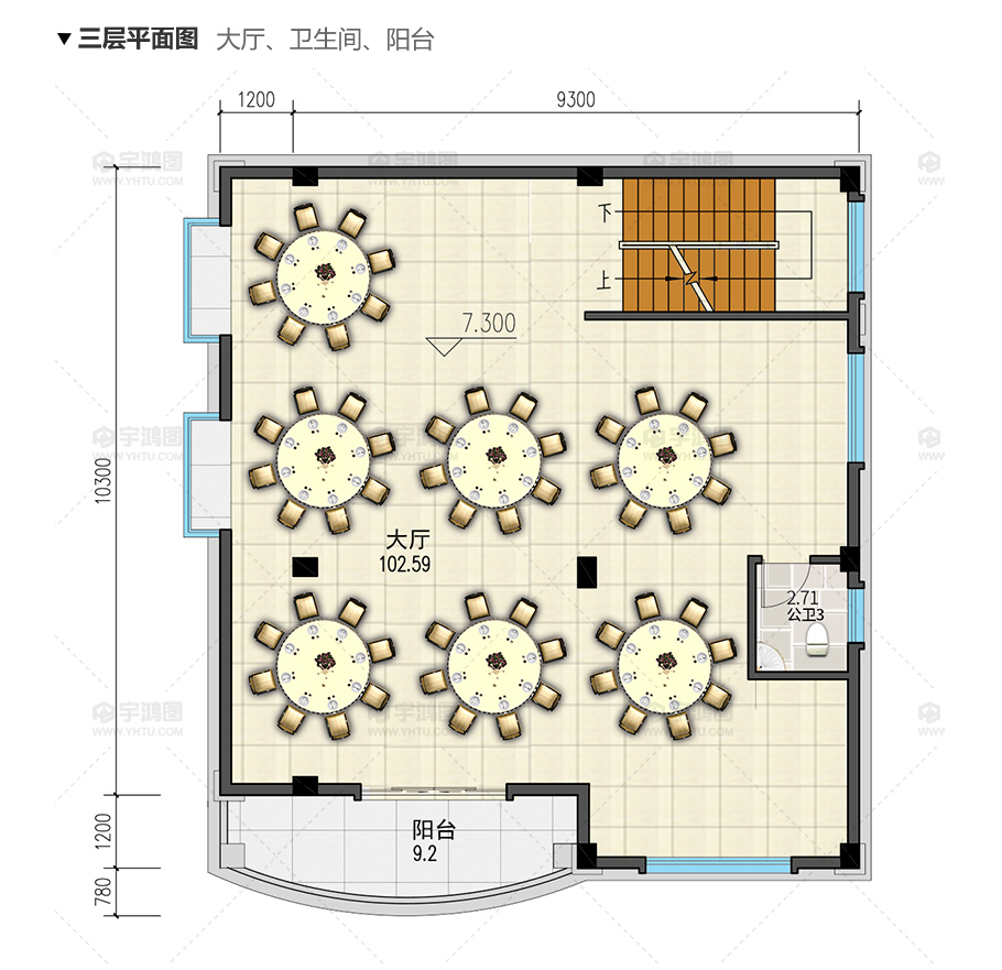 | 開間:10.5米 | 進(jìn)深:12.28米 | 占地面積:101.3平方米 | 建筑面積:342平方米 |