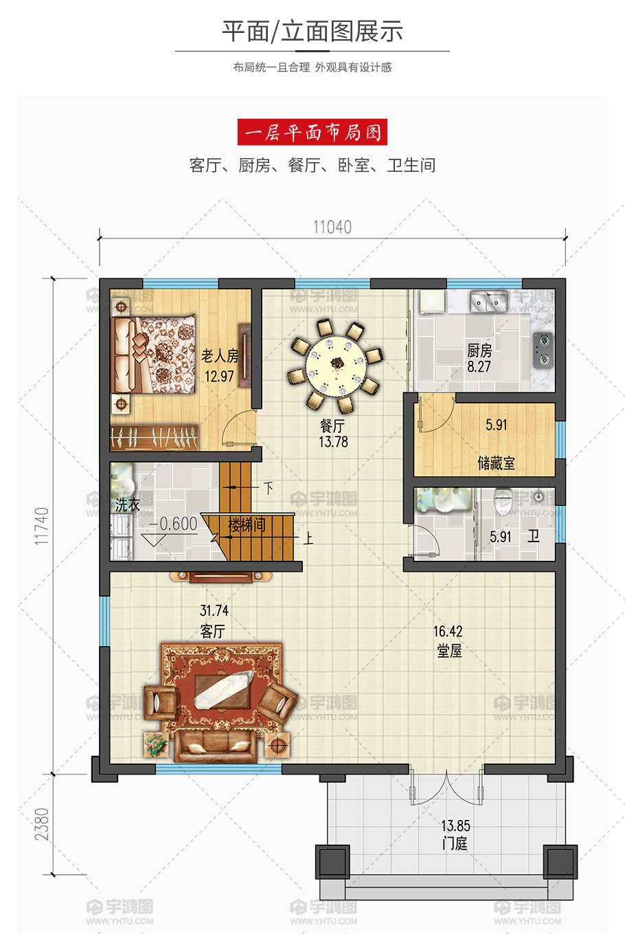 | 開間:11.04米 | 進深:14.12米 | 占地面積:129.6平方米 | 建筑面積:352.29平方米 |