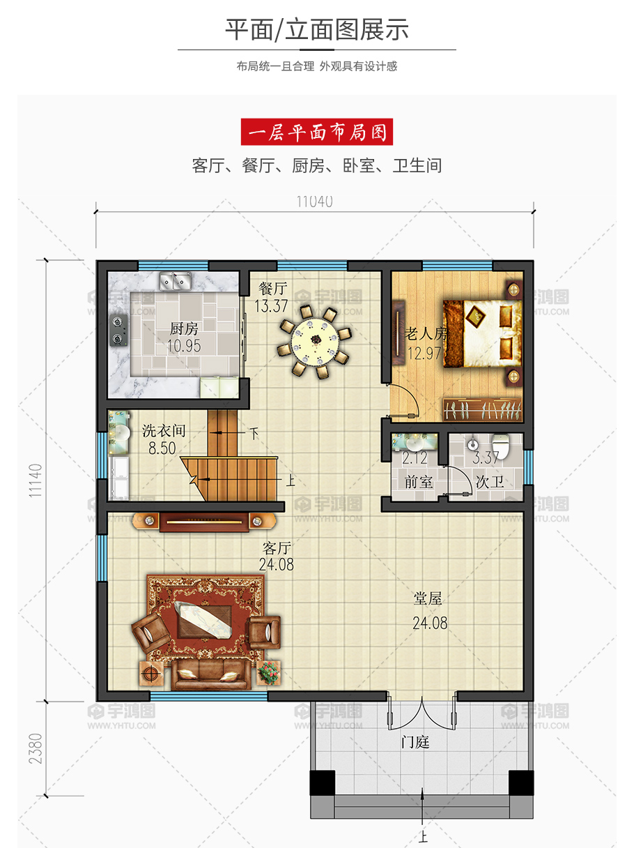 | 開(kāi)間:11.04米 | 進(jìn)深:13.52米 | 占地面積:122.9平方米 | 建筑面積:234.85平方米 |