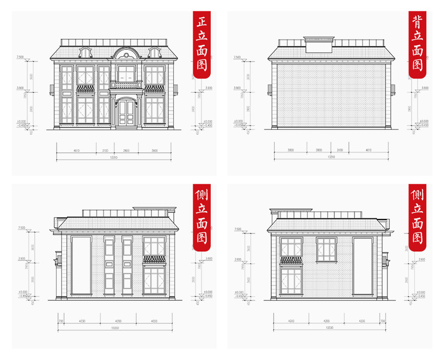 | 建筑圖: | 建筑平面圖:一層平面圖,二層平面圖; 建筑立面圖:東立面圖,西立面圖,南立面圖,北立面圖,剖面圖; 大樣圖:樓梯詳圖,細部大樣,門窗大樣 |