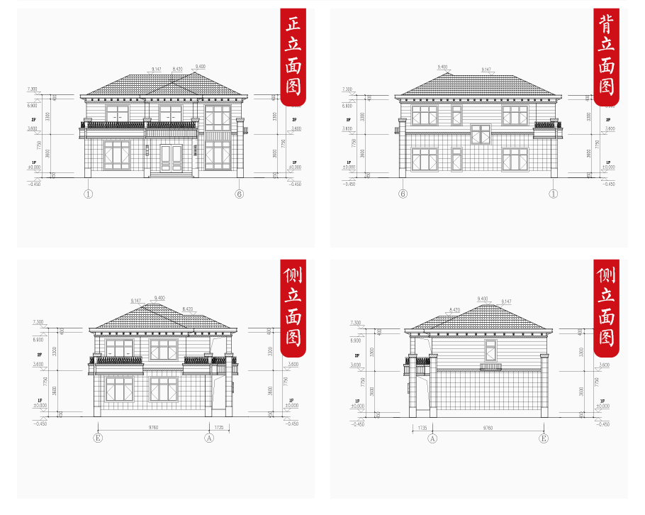 建筑立面圖:東立面圖,西立面圖,南立面圖,北立面圖,剖面圖;