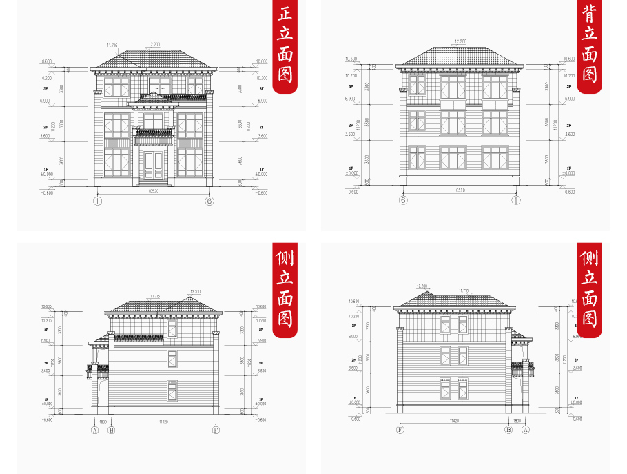 建筑立面圖:東立面圖,西立面圖,南立面圖,北立面圖,剖面圖;