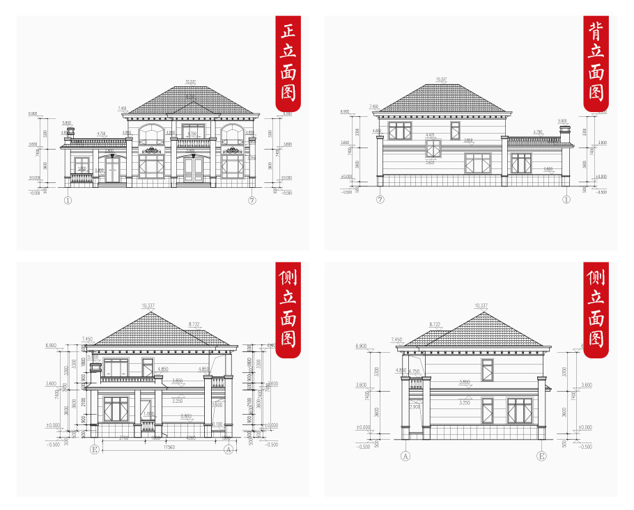 建筑立面圖:東立面圖,西立面圖,南立面圖,北立面圖,剖面圖;