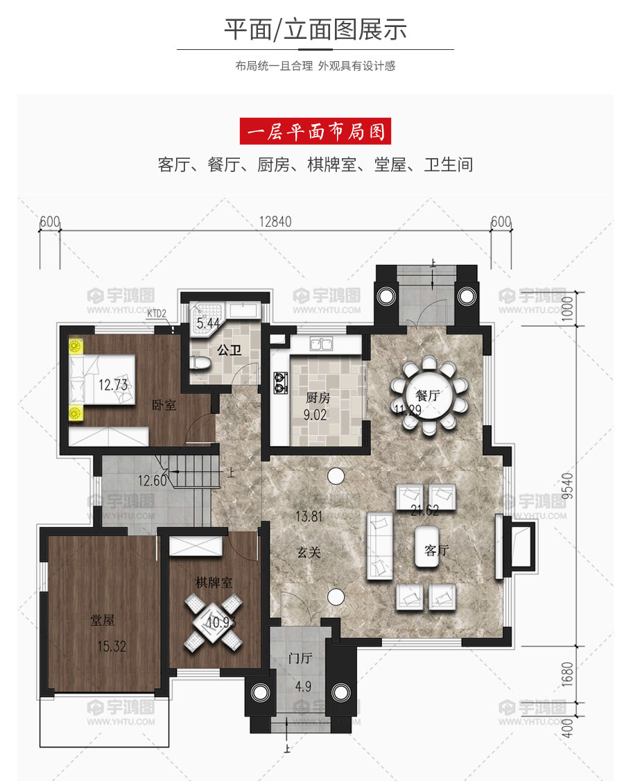 | 開間:14.04米 | 進深:12.62米 | 占地面積:136平方米 | 建筑面積:302平方米 |