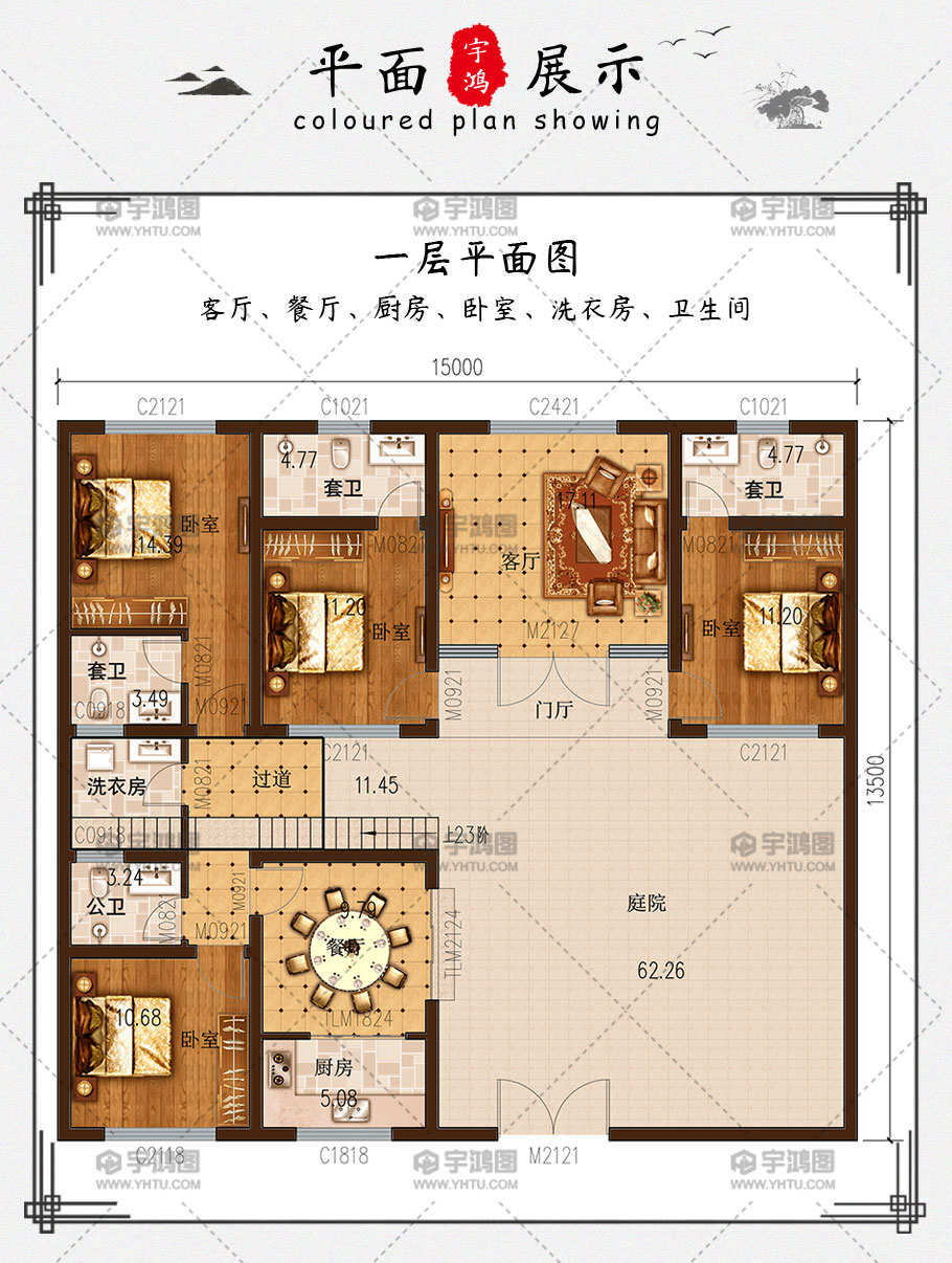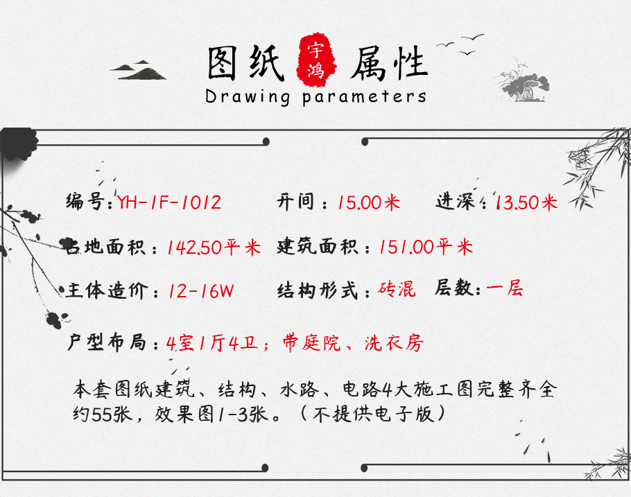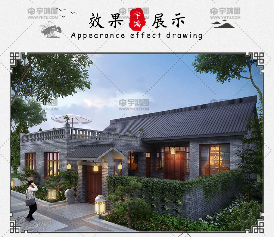| 風格:中式 | 層數(shù):一層 | 結(jié)構(gòu)形式:磚混結(jié)構(gòu) | 圖紙編號:YH-A-1012 |