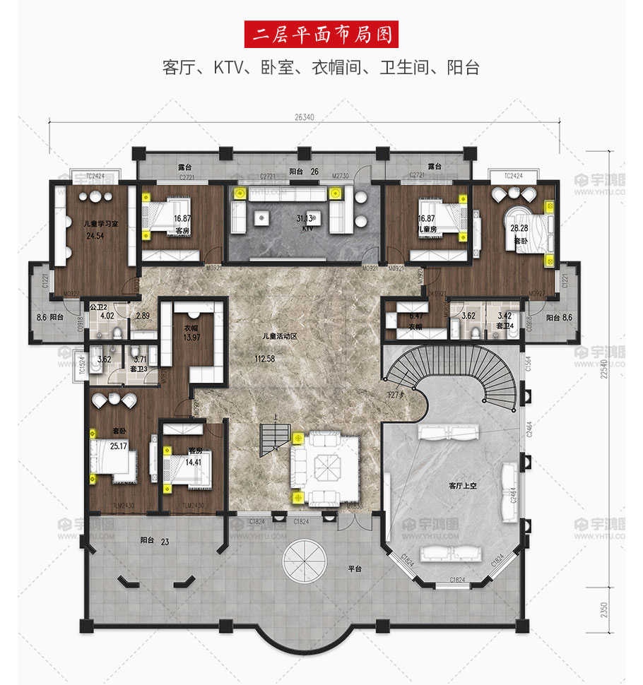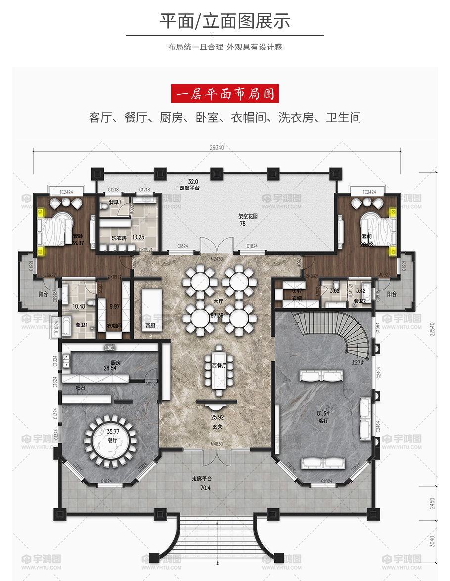 | 開間:26.34米 | 進深:28.03米 | 占地面積:504.3平方米 | 建筑面積:1195.1平方米 |