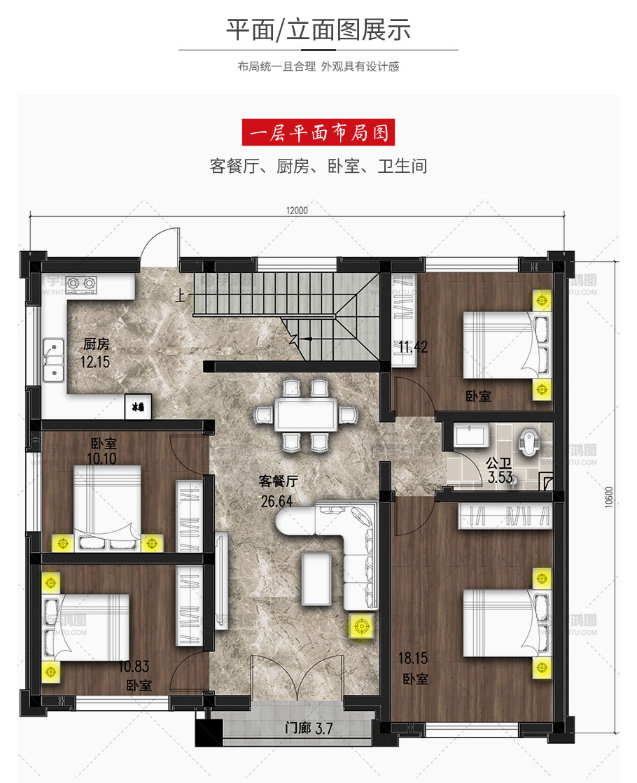 | 開間:12米 | 進深:10.6米 | 占地面積:122.5平方米 | 建筑面積:203平方米 |