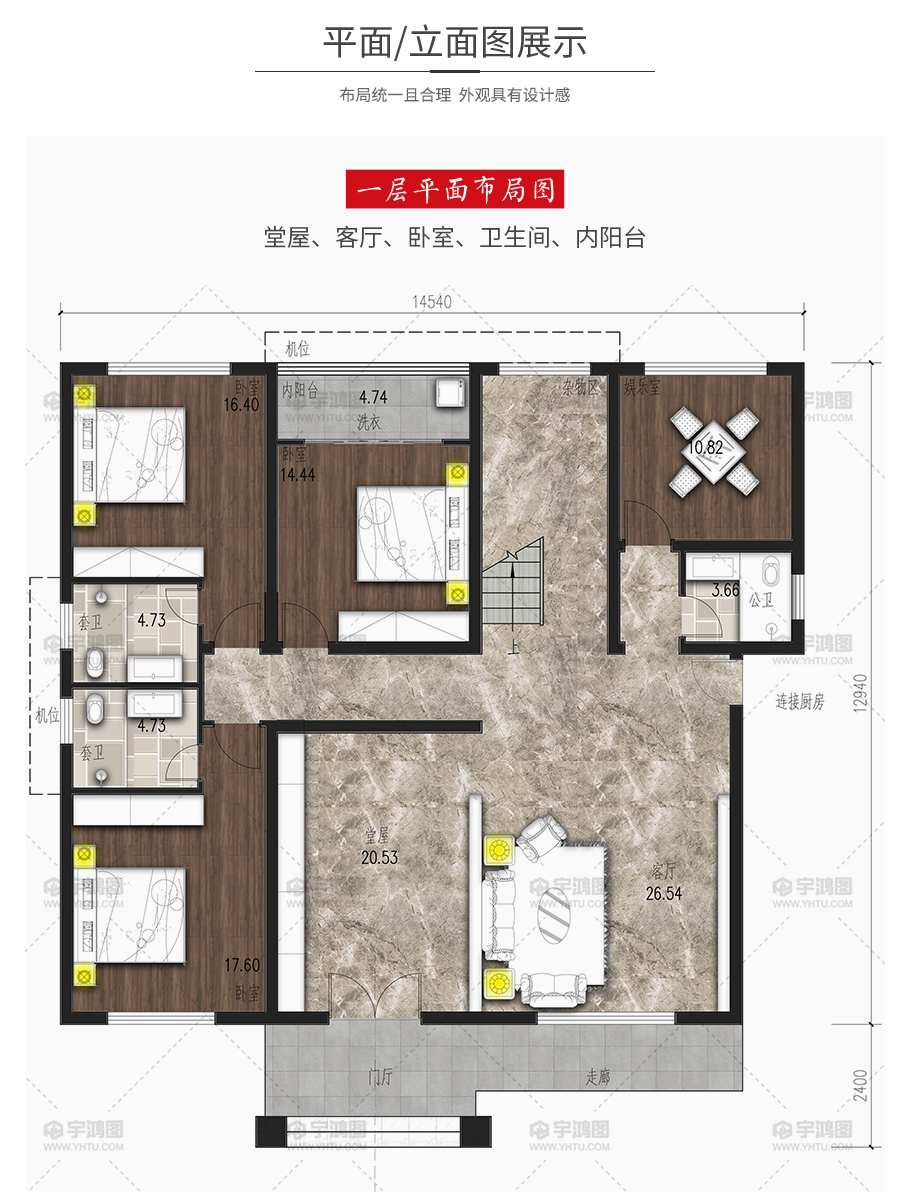 | 開間:14.54米 | 進深:15.34米 | 占地面積:179.5平方米 | 建筑面積:373.2平方米 |