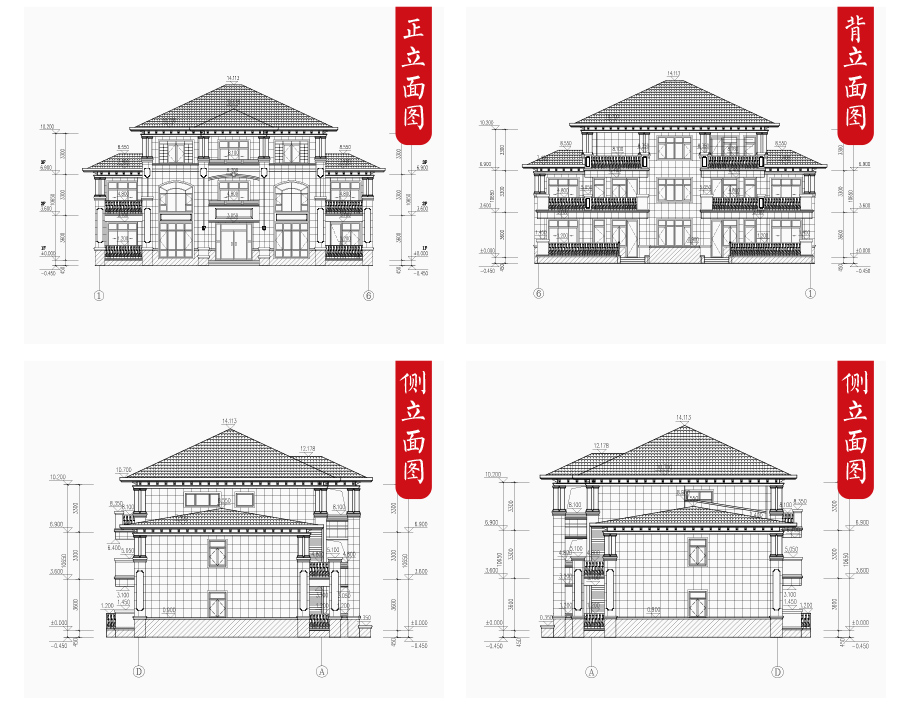 建筑立面圖:東立面圖,西立面圖,南立面圖,北立面圖,剖面圖;