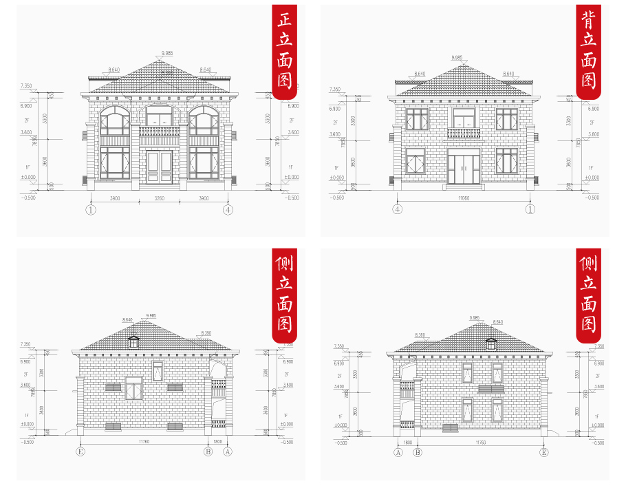 建筑立面圖:東立面圖,西立面圖,南立面圖,北立面圖,剖面圖;