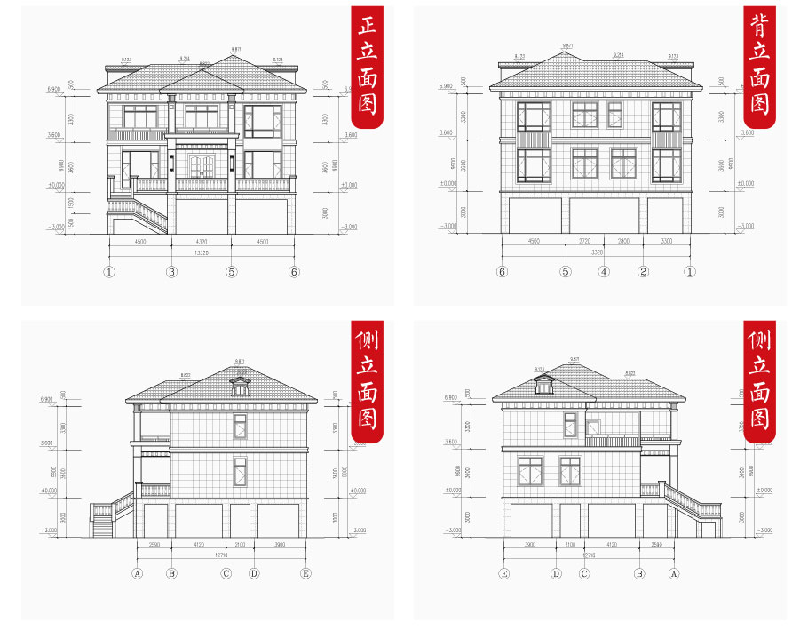 建筑立面圖:東立面圖,西立面圖,南立面圖,北立面圖,剖面圖;