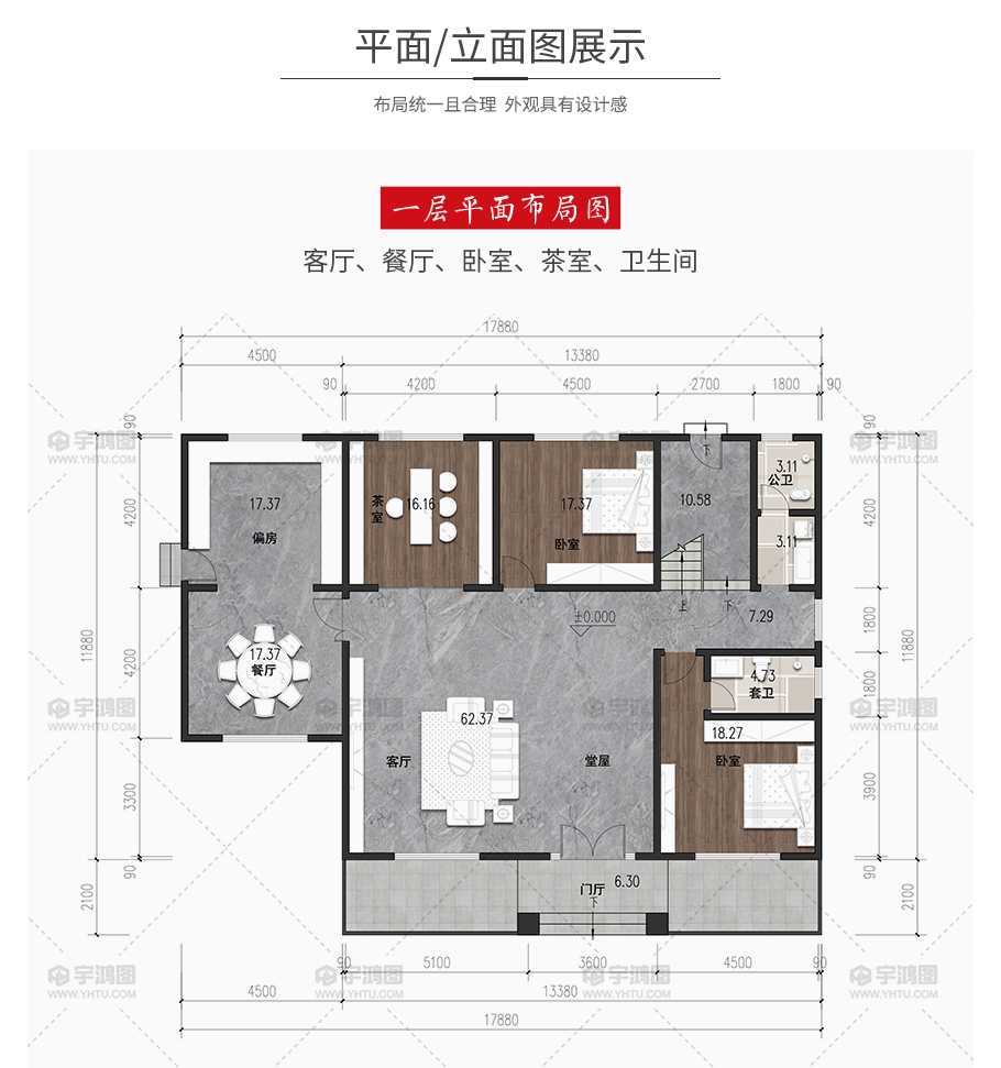 | 開間:17.88米 | 進深:13.98米 | 占地面積:203.9平方米 | 建筑面積:449.73平方米 |