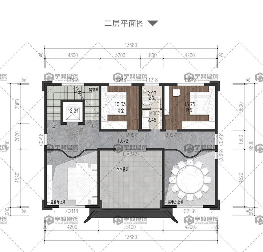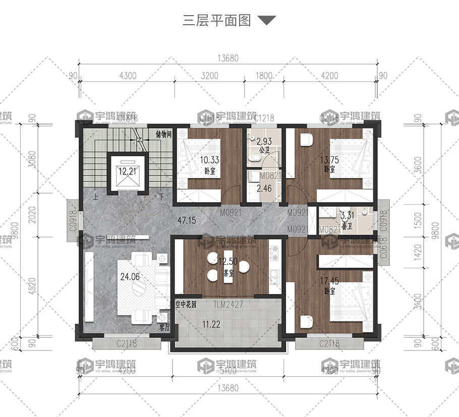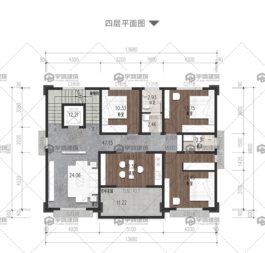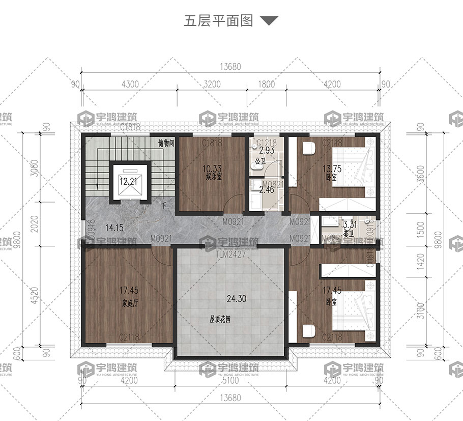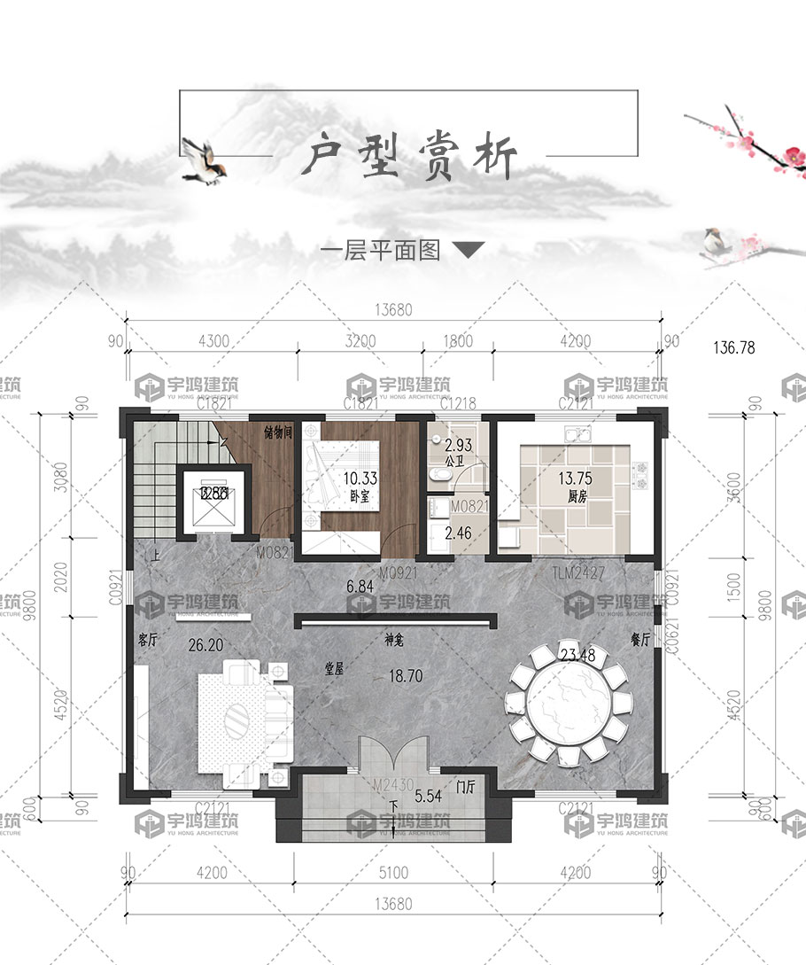 | 開間:13.68米 | 進深:10.4米 | 占地面積:136.78平方米 | 建筑面積:595.84平方米 |