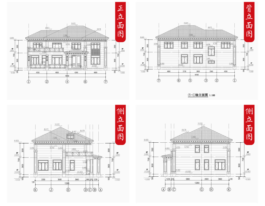 | 建筑圖: | 建筑平面圖:一層平面圖,二層平面圖; 建筑立面圖:東立面圖,西立面圖,南立面圖,北立面圖,剖面圖; 大樣圖:樓梯詳圖,細部大樣,門窗大樣 |