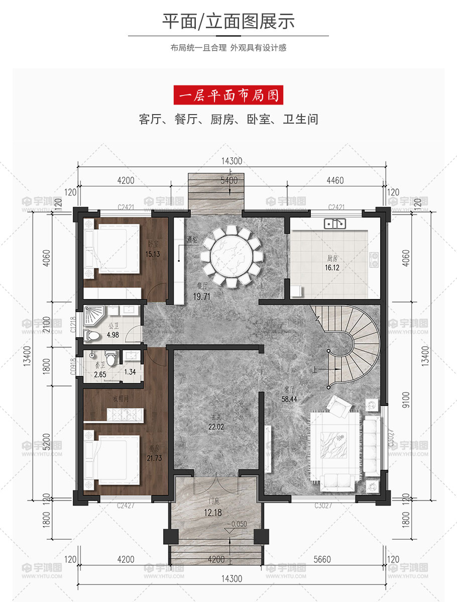 | 開間:14.3米 | 進深:13.4米 | 占地面積:199平方米 | 建筑面積:500.1平方米 |