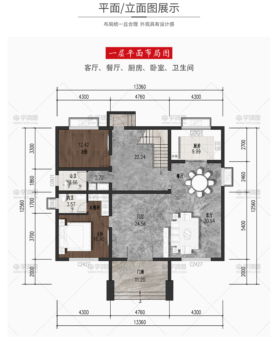 | 開間:13.36米 | 進深:12.56米 | 占地面積:159.33平方米 | 建筑面積:420平方米 |