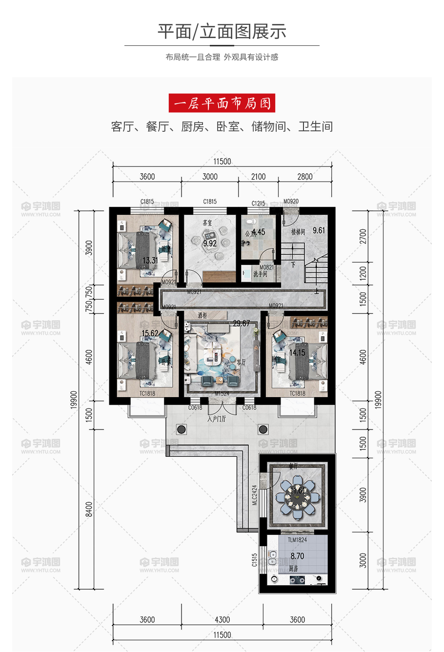 | 開間:11.5米 | 進深:19.9米 | 占地面積:163.41平方米 | 建筑面積:375.35平方米 |
