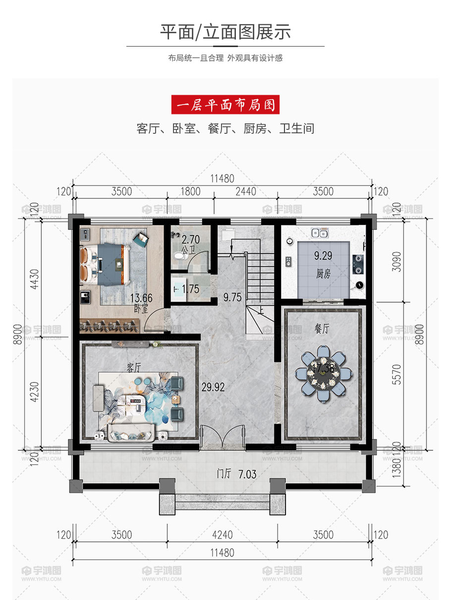 | 開間:11.48米 | 進深:8.9米 | 占地面積:110平方米 | 建筑面積:205.6平方米 |