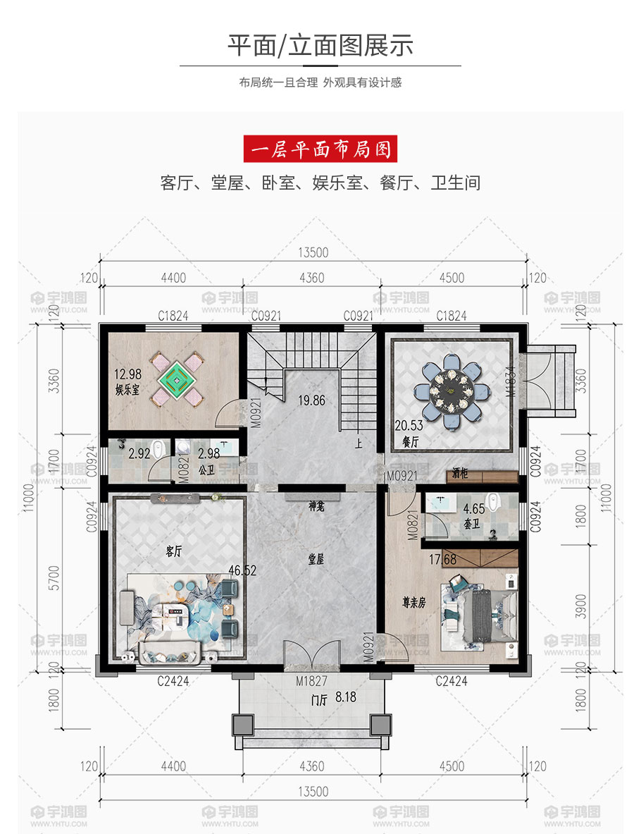建筑立面圖:東立面圖,西立面圖,南立面圖,北立面圖,剖面圖;