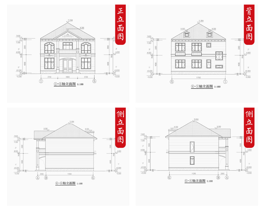 | 建筑圖: | 建筑平面圖:一層平面圖,二層平面圖; 建筑立面圖:東立面圖,西立面圖,南立面圖,北立面圖,剖面圖; 大樣圖:樓梯詳圖,細部大樣,門窗大樣 |