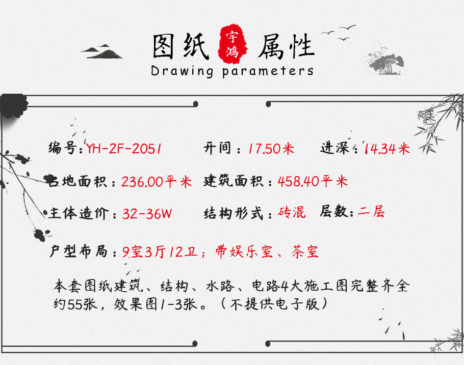 | 風格:中式 | 層數:二層 | 結構形式:磚混結構 | 圖紙編號:YH-A-2051 |