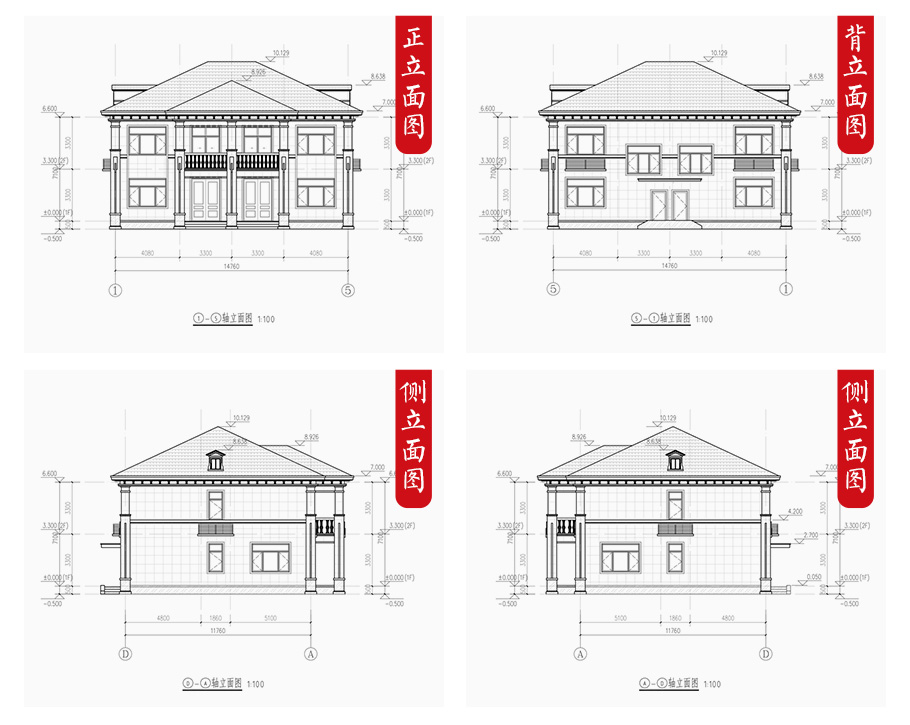 | 建筑圖: | 建筑平面圖:一層平面圖,二層平面圖; 建筑立面圖:東立面圖,西立面圖,南立面圖,北立面圖,剖面圖; 大樣圖:樓梯詳圖,細部大樣,門窗大樣 |