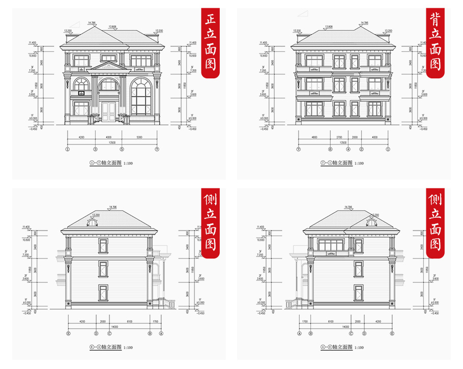 建筑平面圖:一層平面圖,二層平面圖,三層平面圖; 建筑立面圖:東立面圖,西立面圖,南立面圖,北立面圖,剖面圖; 大樣圖:樓梯詳圖,細部大樣,門窗大樣 |