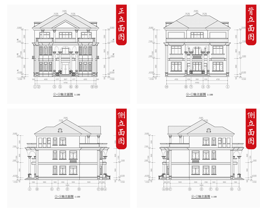 | 建筑圖: | 建筑平面圖:一層平面圖,二層平面圖,三層平面圖; 建筑立面圖:東立面圖,西立面圖,南立面圖,北立面圖,剖面圖; 大樣圖:樓梯詳圖,細部大樣,門窗大樣 |