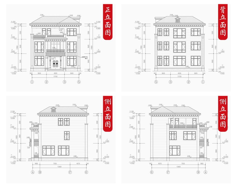 建筑平面圖:一層平面圖,二層平面圖,三層平面圖; 建筑立面圖:東立面圖,西立面圖,南立面圖,北立面圖,剖面圖; 大樣圖:樓梯詳圖,細(xì)部大樣,門窗大樣 |