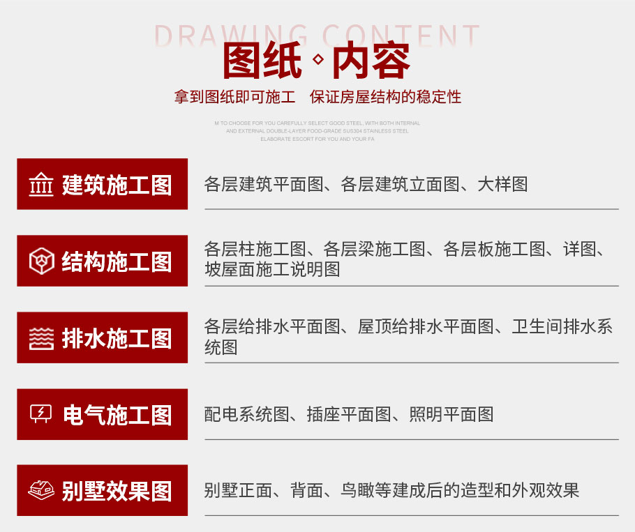 建筑平面圖:一層平面圖,二層平面圖; 建筑立面圖:東立面圖,西立面圖,南立面圖,北立面圖,剖面圖; 大樣圖:樓梯詳圖,細(xì)部大樣,門窗大樣 |