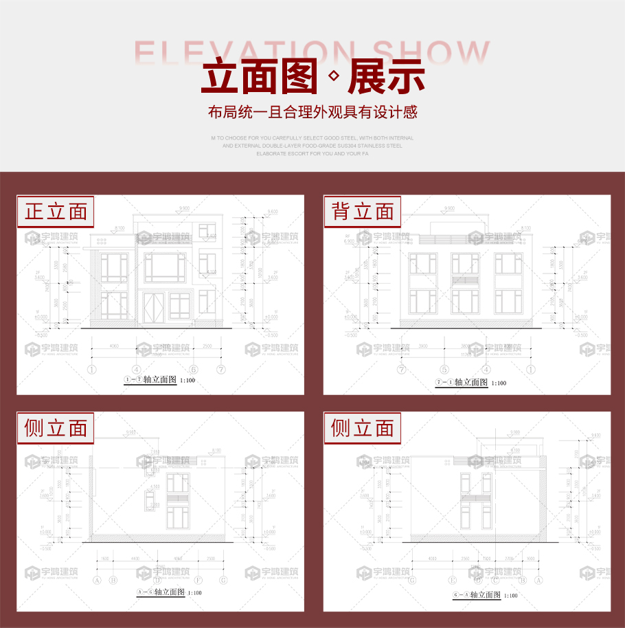 | 建筑圖: | 建筑平面圖:一層平面圖,二層平面圖; 建筑立面圖:東立面圖,西立面圖,南立面圖,北立面圖,剖面圖; 大樣圖:樓梯詳圖,細(xì)部大樣,門窗大樣 |