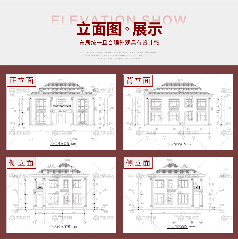 建筑平面圖:一層平面圖,二層平面圖; 建筑立面圖:東立面圖,西立面圖,南立面圖,北立面圖,剖面圖; 大樣圖:樓梯詳圖,細(xì)部大樣,門窗大樣 |