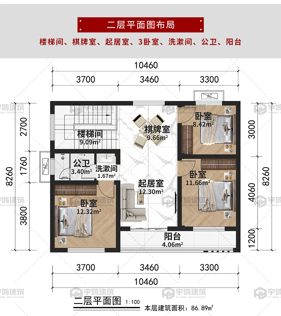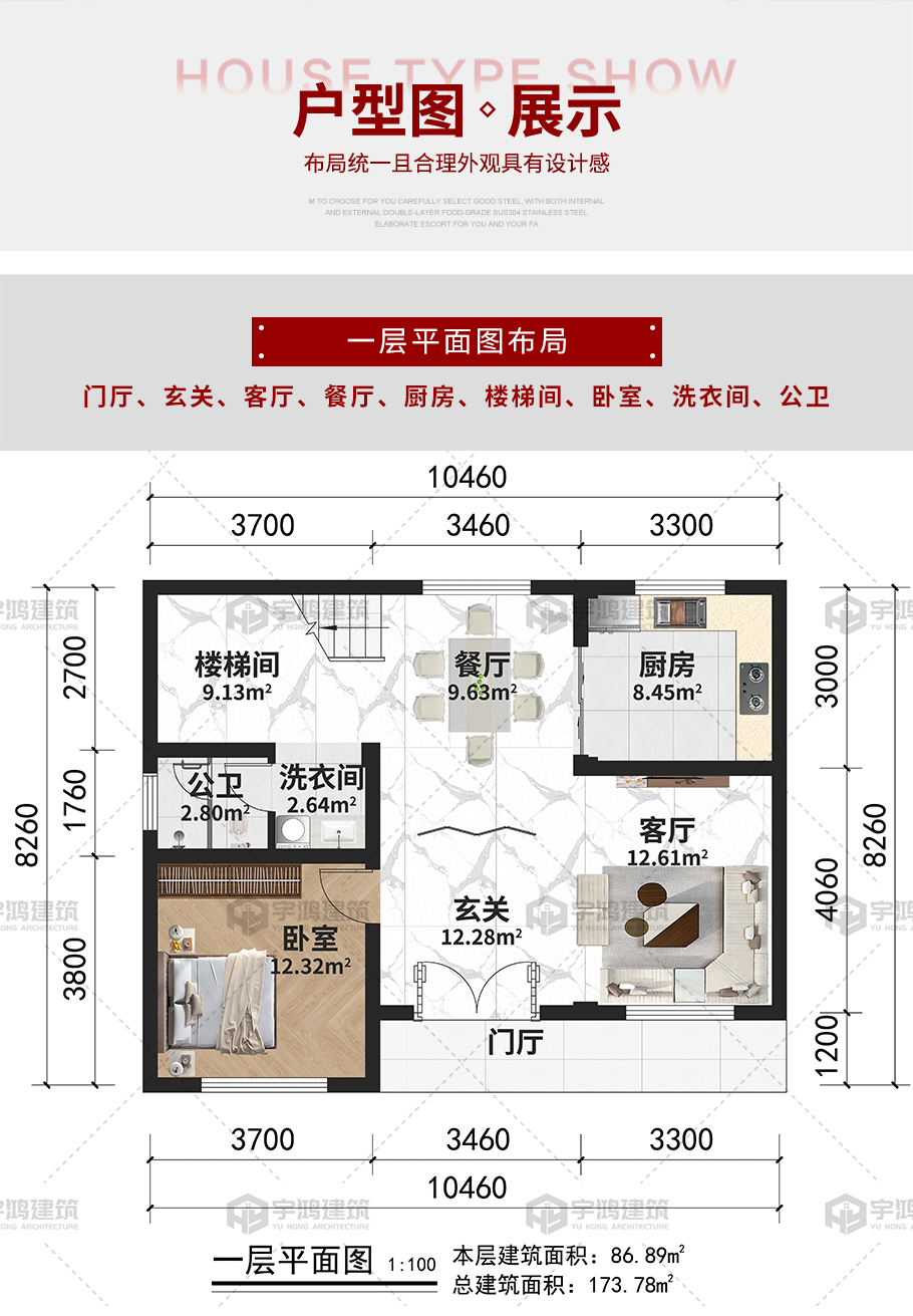 | 開(kāi)間:10.46米 | 進(jìn)深:8.26米 | 占地面積:90.95平方米 | 建筑面積:173.78平方米 |