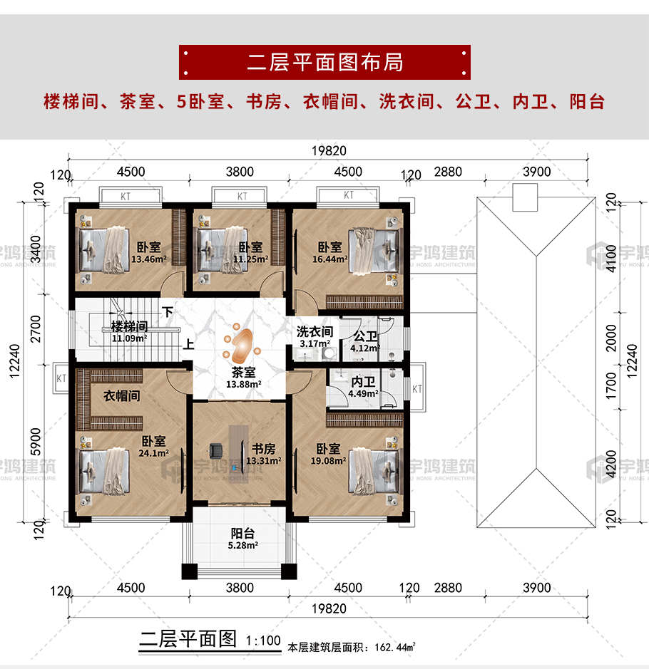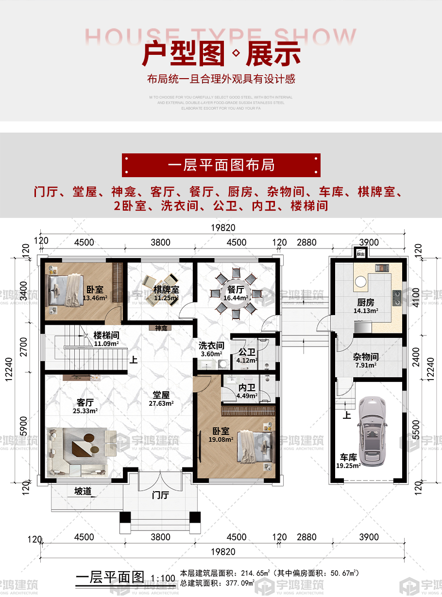 | 開間:19.82米 | 進深:12.24米 | 占地面積:217.88平方米 | 建筑面積:377.09平方米 |