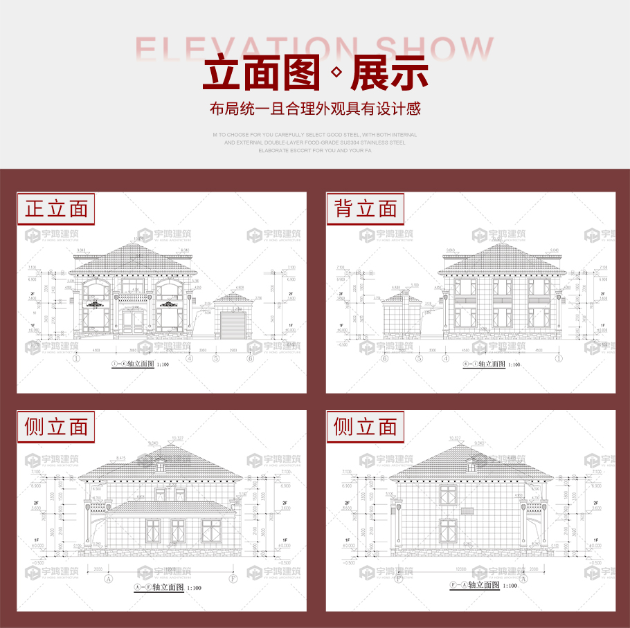 | 建筑圖: | 建筑平面圖:一層平面圖,二層平面圖; 建筑立面圖:東立面圖,西立面圖,南立面圖,北立面圖,剖面圖; 大樣圖:樓梯詳圖,細部大樣,門窗大樣 |