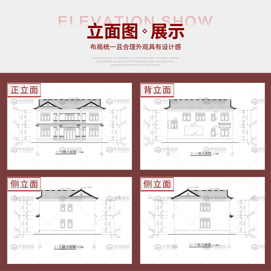 建筑平面圖:一層平面圖,二層平面圖; 建筑立面圖:東立面圖,西立面圖,南立面圖,北立面圖,剖面圖; 大樣圖:樓梯詳圖,細(xì)部大樣,門窗大樣 |