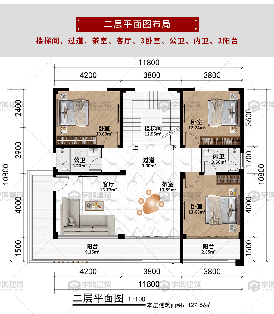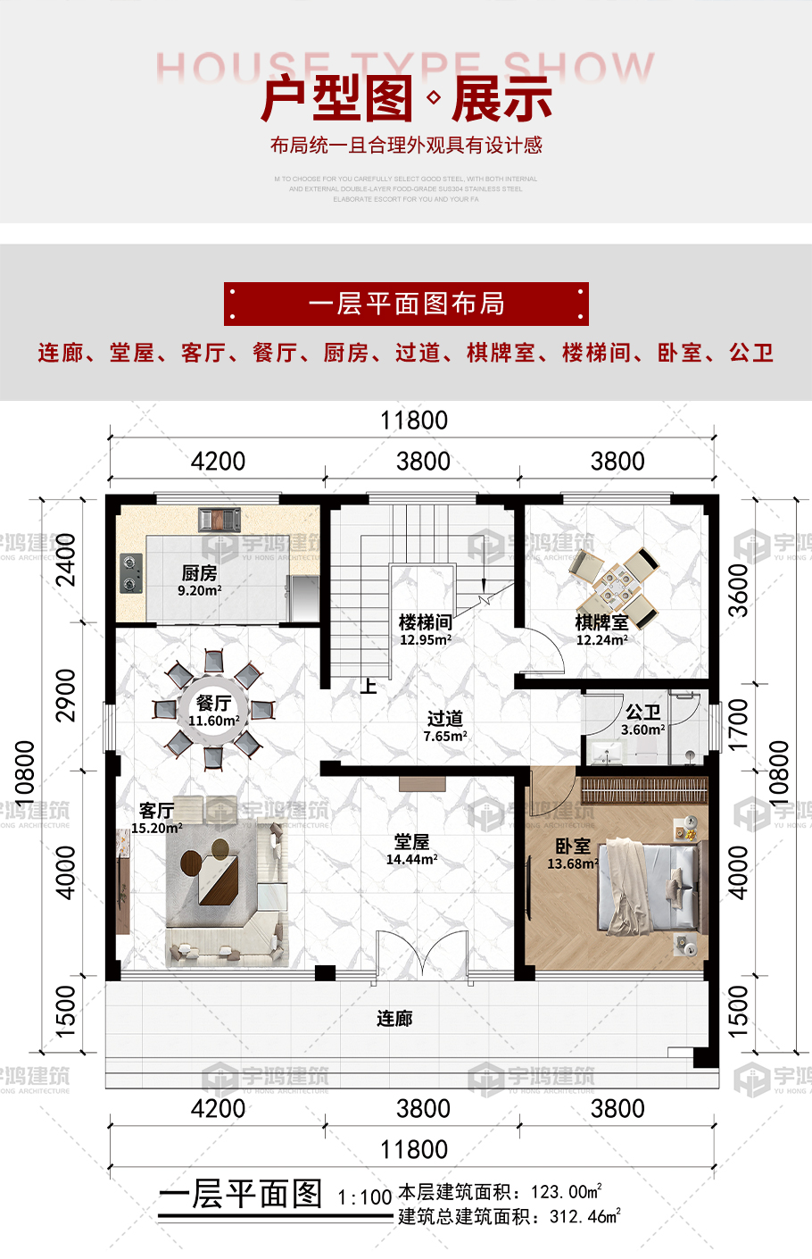 | 開間:11.8米 | 進深:10.8米 | 占地面積:123平方米 | 建筑面積:312.46平方米 |