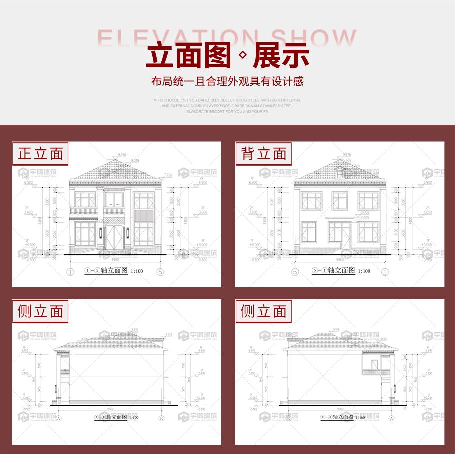 | 建筑圖: | 建筑平面圖:一層平面圖,二層平面圖; 建筑立面圖:東立面圖,西立面圖,南立面圖,北立面圖,剖面圖; 大樣圖:樓梯詳圖,細部大樣,門窗大樣 |