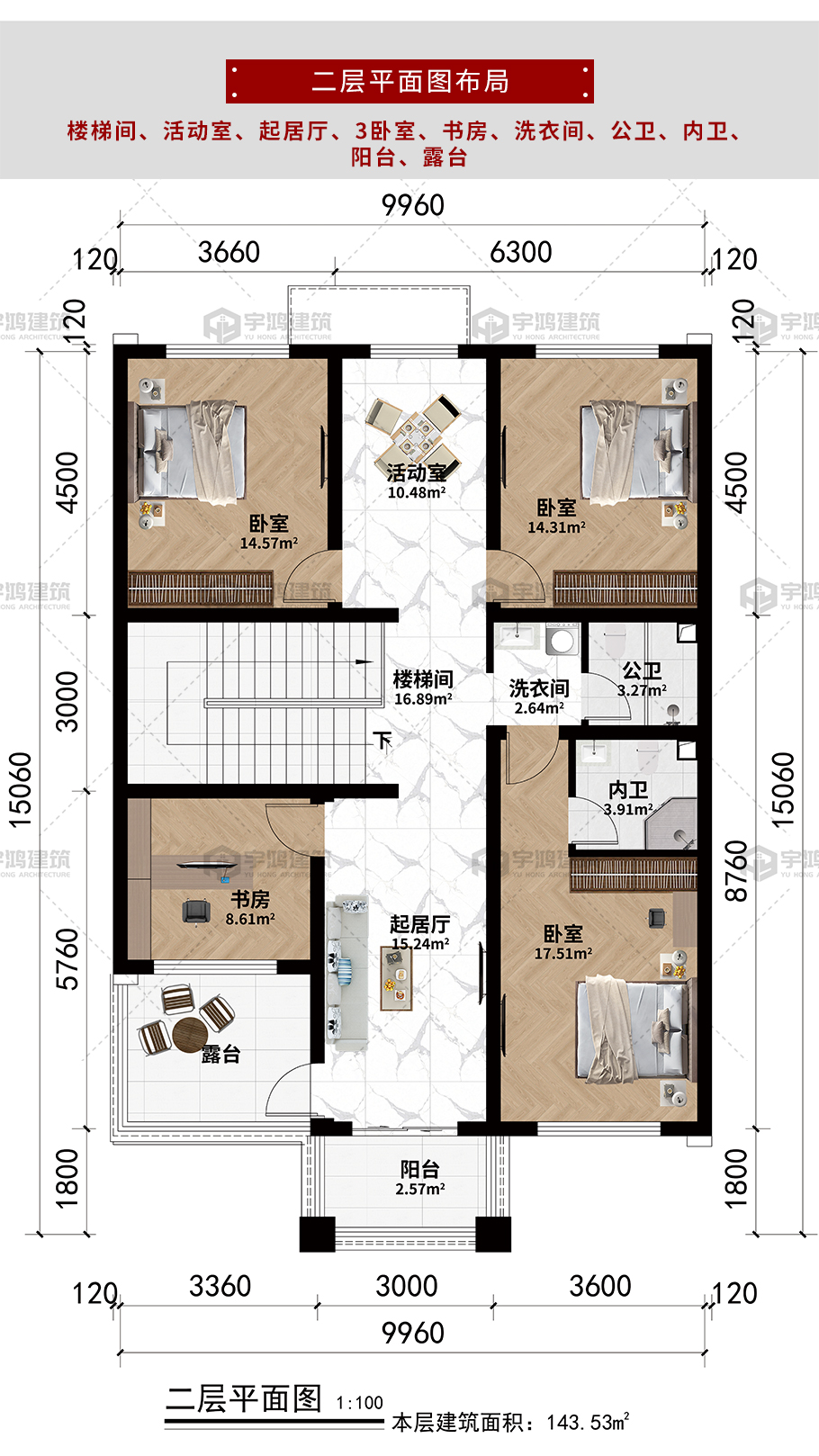 | 開間:9.96米 | 進深:15.06米 | 占地面積:143.53平方米 | 建筑面積:287.06平方米 |