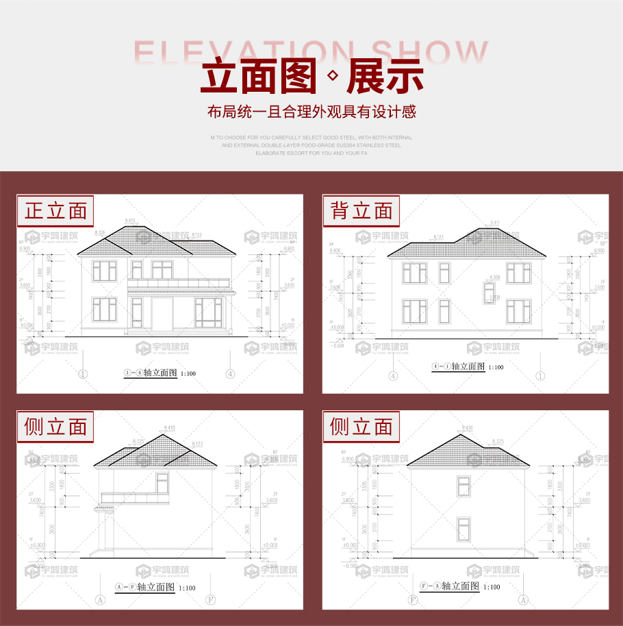 | 建筑圖: | 建筑平面圖:一層平面圖,二層平面圖; 建筑立面圖:東立面圖,西立面圖,南立面圖,北立面圖,剖面圖; 大樣圖:樓梯詳圖,細部大樣,門窗大樣 |