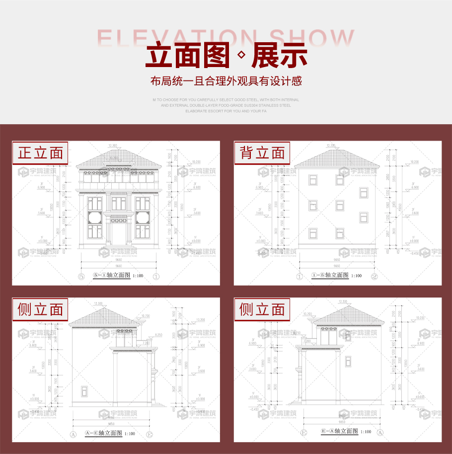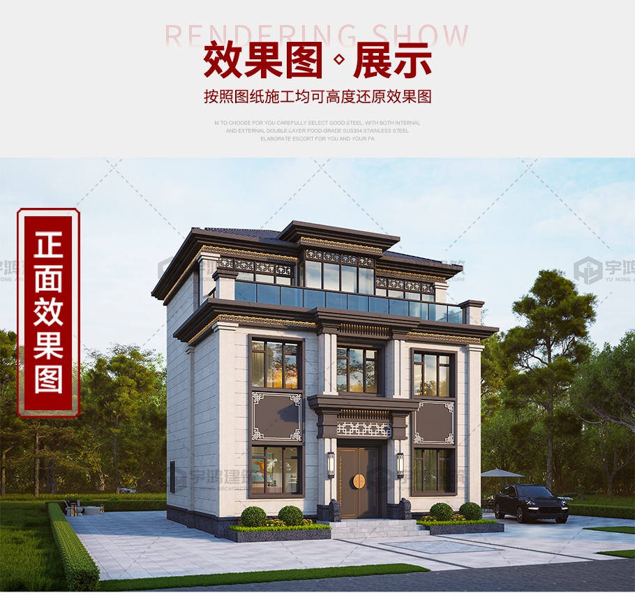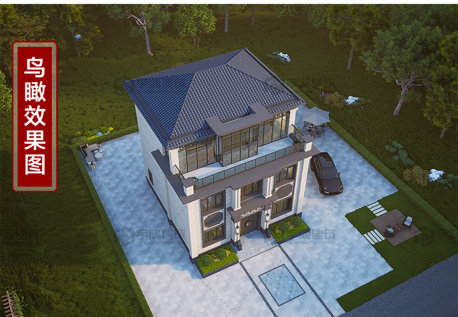 成品圖紙>開間進深9.66*9.85新中式三層別墅全套圖紙