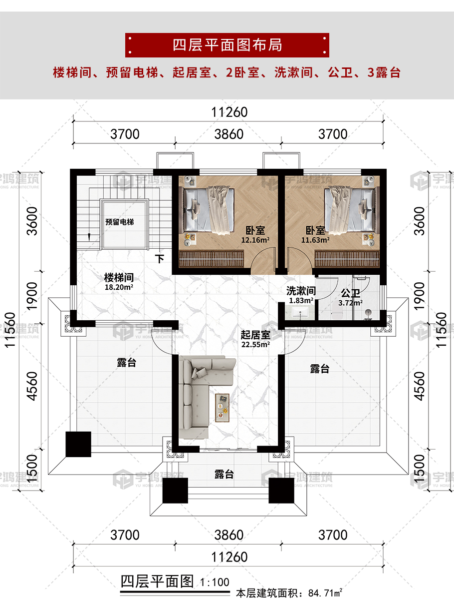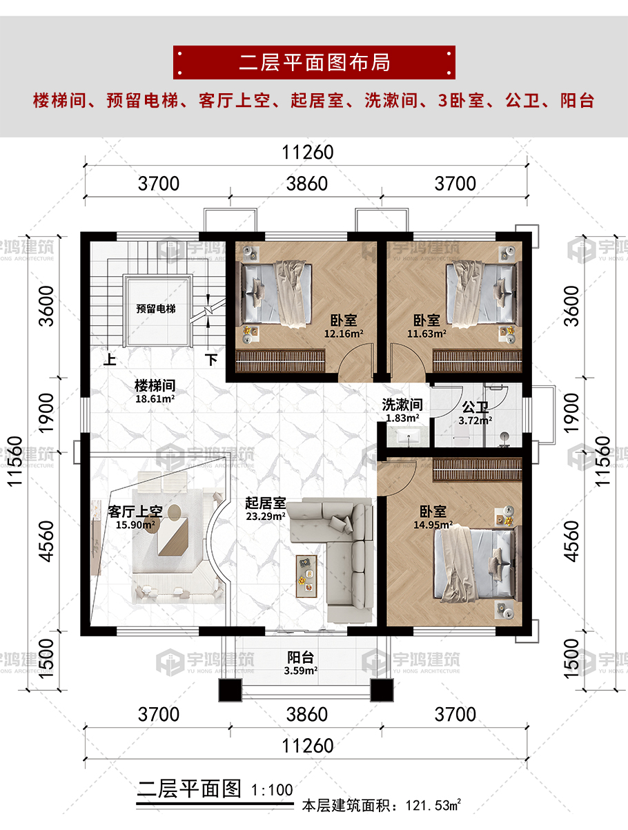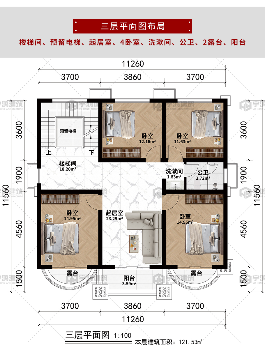 | 開間:11.26米 | 進深:11.56米 | 占地面積:121.53平方米 | 建筑面積:449.3平方米 |